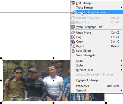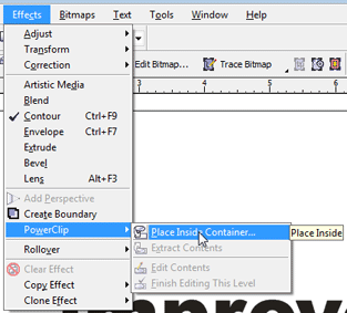 8. Ingat, gambar masih dalam keadaan terseleksi dengan ditandainya kotak-kotak di sekitar gambar, pilih menu Effects > PowerClip > Place Inside Container.